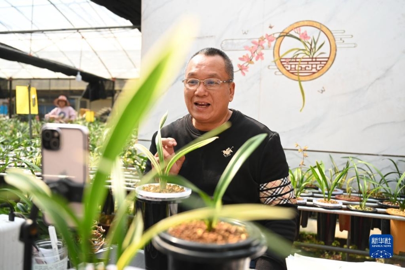 新華社福州5月5日電(記者周義)“在網(wǎng)上和粉絲賞蘭花、聊蘭花,一來二去,顧客越來越多?!痹诟=ㄕ闹莸闹辈ラg內(nèi),臺灣農(nóng)民許傳輝一早就擺上幾盆蘭花,開始“帶貨”。