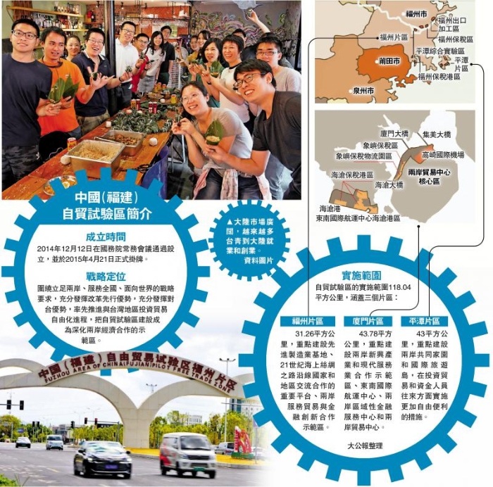 《中國(福建)自由貿(mào)易試驗區(qū)總體方案》提出,要充分發(fā)揮對臺優(yōu)勢,率先推進與臺灣地區(qū)投資貿(mào)易自由化進程,把自貿(mào)試驗區(qū)建設(shè)成為深化兩岸經(jīng)濟合作的示范區(qū)。今年1月出臺的《福建自貿(mào)試驗區(qū)提升戰(zhàn)略實施方案》再度明確,深化閩臺各領(lǐng)域融合,建設(shè)兩岸融合發(fā)展示范區(qū),打造臺胞臺企登陸第一家園。