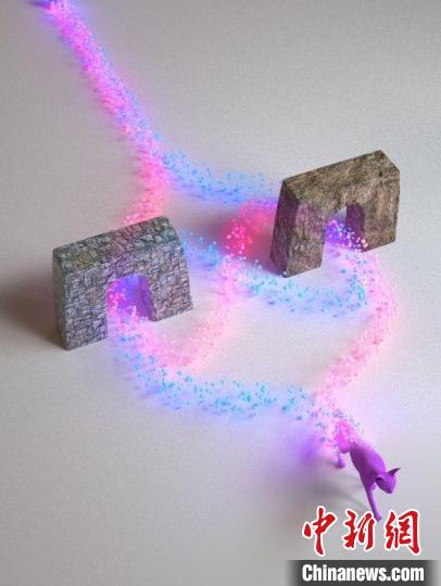 量子不確定因果序的示意圖。藍(lán)色和紅色路線經(jīng)過(guò)兩個(gè)門(mén)的時(shí)序不同且處于量子疊加態(tài)?!≈袊?guó)科大供圖