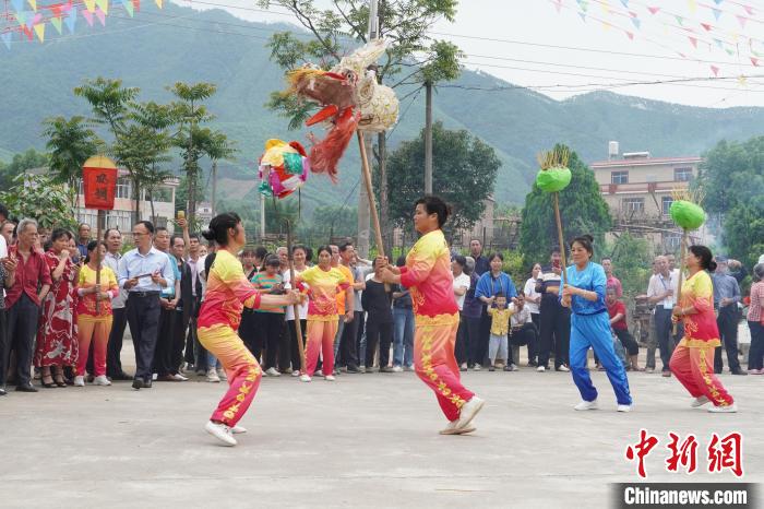 圖為臺灣花蓮縣客家鄉(xiāng)村振興農(nóng)商交流參訪團在客家先祖三王廟觀看客家民俗表演?!堁艥?攝