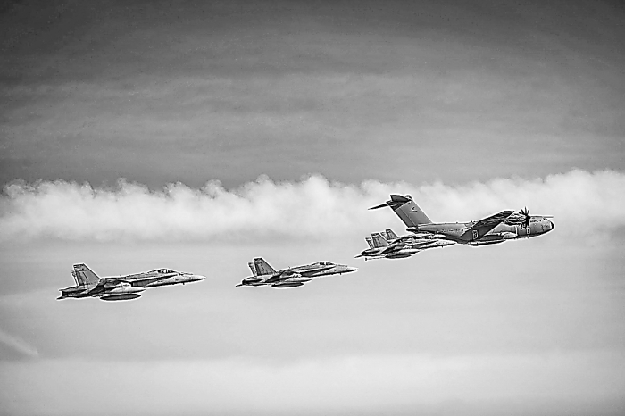 一架德國(guó)空軍A400M運(yùn)輸機(jī)與四架芬蘭空軍F/A-18戰(zhàn)機(jī)編隊(duì)飛行。資料圖片