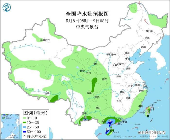 5月8日08時(shí)至9日08時(shí),甘肅南部、青海南部、西藏北部等地部分地區(qū)有小到中雪或雨夾雪,部分地區(qū)有大到暴雪;四川盆地北部、云南東南部、廣西東南部、廣東西南部、海南島、臺(tái)灣島等地部分地區(qū)有中到大雨,其中,廣西東南部沿海、廣東西南部、海南島等地局部地區(qū)有暴雨(50~95毫米)。內(nèi)蒙古東北部、黑龍江等地部分地區(qū)有4~5級(jí)風(fēng);東海、臺(tái)灣海峽將有7級(jí)、陣風(fēng)8級(jí)的東北風(fēng)。