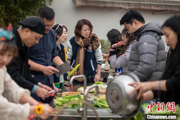圖為2023年2月18日,莊慈芯(中)在“諾愛(ài)之家”農(nóng)場(chǎng),與朋友們一起洗菜。 中新社記者 劉忠俊 攝
