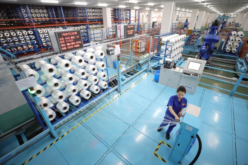 在位于江蘇省蘇州市吳江區(qū)的恒力(蘇州)產(chǎn)業(yè)園內的高性能滌綸工業(yè)絲智能車間內,員工對工業(yè)絲進行包裝前的外檢作業(yè)(3月15日攝)。新華社記者 毛俊 攝