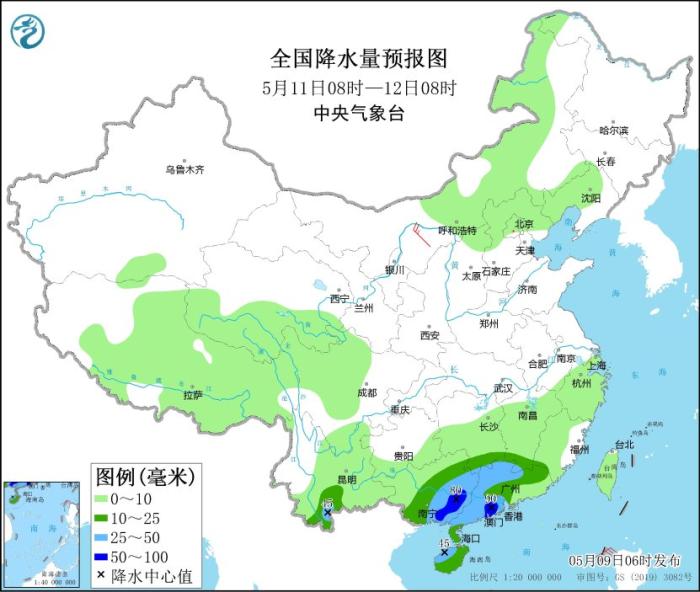 5月9日,廣東西南部、海南島、云南南部等地的部分地區(qū)有中到大雨,局地有暴雨。上述部分地區(qū)伴有短時(shí)強(qiáng)降水(最大小時(shí)降雨量20~30毫米,局地可超過(guò)50毫米),局地有雷暴大風(fēng)等強(qiáng)對(duì)流天氣。