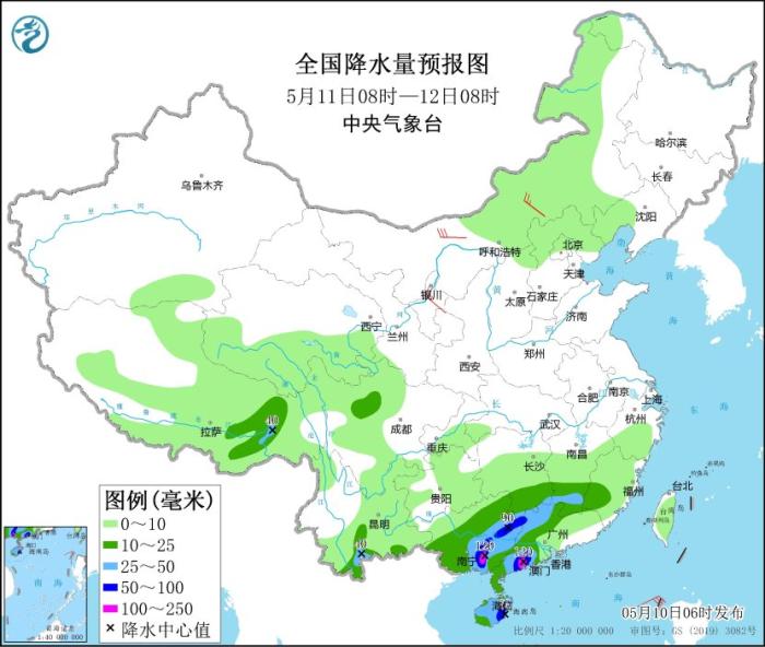 全國降水量預(yù)報(bào)圖(5月10日08時(shí)-11日08時(shí))