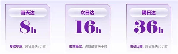 “唯快不破”是跨越速運(yùn)堅(jiān)信的永恒真理。在16年的磨練中,跨越速運(yùn)不斷挑戰(zhàn)更快時(shí)效,從2009年的“夜發(fā)晨至”到2017年的“六小時(shí)跨省送達(dá)”,依托強(qiáng)大的航空能力,成功打造三個(gè)明星產(chǎn)品:當(dāng)日達(dá)、次日達(dá)、隔日達(dá)。目前,基于“深耕航空、力保時(shí)效”的戰(zhàn)略耐性,跨越速運(yùn)已構(gòu)建足以滿足各類國(guó)際賽事需求的國(guó)內(nèi)、國(guó)際、海陸空立體業(yè)務(wù)網(wǎng)絡(luò)。
