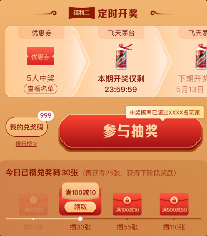 活動規(guī)則:用戶每日參與定時抽獎可獲得獎券碼,用于參與之后每一場開獎活動?!附袢諆丢劥a」每日重置,保底獎勵每日更新;