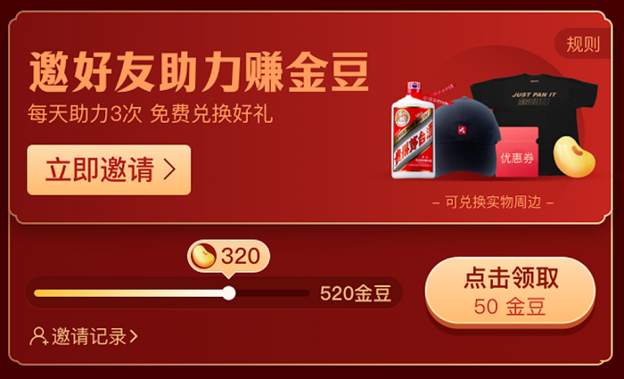 活動規(guī)則:用戶點擊「立即邀請」按鈕,分享「福利中心」頁面,好友通過分享鏈接進入該頁面后邀請人獲得相應(yīng)金豆獎勵;活動期間每人最多可獲得520金豆。