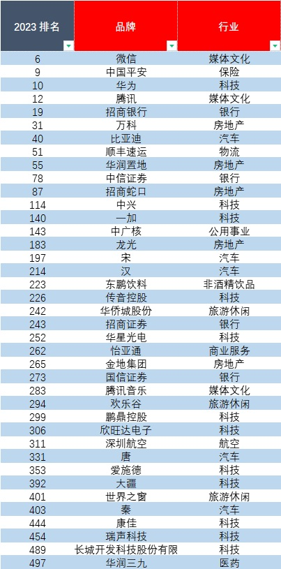 圖中為2023年中國品牌價值500強中39個上榜的深圳品牌