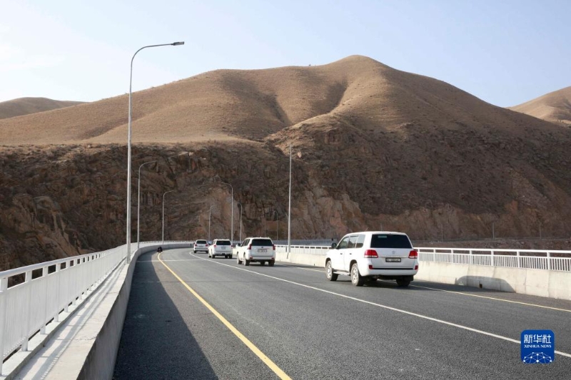 2021年11月10日,汽車行駛在吉爾吉斯斯坦新北南公路二期工程的一座大橋上。新華社發(fā)(羅曼 攝)