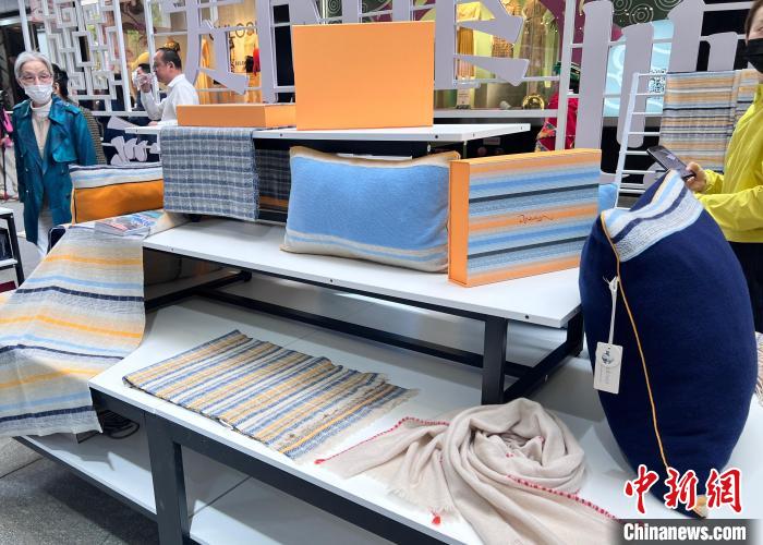 在另一側(cè)展臺(tái)上,陳列著由氆氌制成的披肩、圍巾、蓋毯等物?!懊饋?lái)又糯又軟”“圍巾配色好美,也很好搭衣服”……前來(lái)參加“日喀則市及五縣‘五五’消費(fèi)展”的上海民眾,向氆氌制品投去好奇又欣賞的目光,忍不住伸手撫摸。