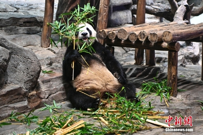 大熊貓“隆仔”吃竹子,萌態(tài)十足。中新社記者 陳驥旻 攝