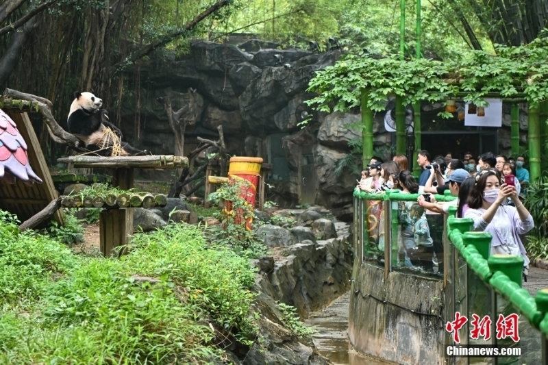 大熊貓“隆隆”坐在冰塊上消暑,萌態(tài)十足。中新社記者 陳驥旻 攝