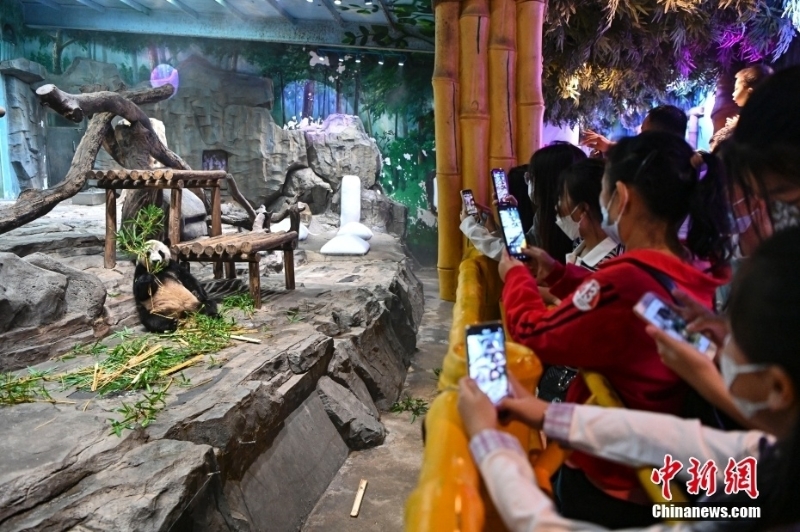 生活在長(zhǎng)隆野生動(dòng)物世界內(nèi)的大熊貓“婷仔”吃竹子。中新社記者 陳驥旻 攝