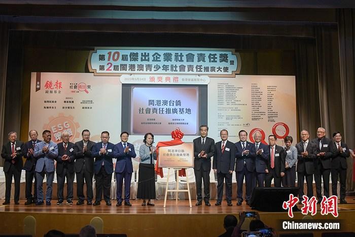 5月14日,香港鏡報(bào)月刊主辦的第10屆杰出企業(yè)社會(huì)責(zé)任獎(jiǎng)暨第2屆閩港澳青少年社會(huì)責(zé)任推廣大使頒獎(jiǎng)典禮在香港會(huì)議展覽中心演講廳舉行。圖為主禮嘉賓主持閩港澳臺(tái)僑社會(huì)責(zé)任推廣基地揭牌儀式。 中新社記者 陳永諾 攝
