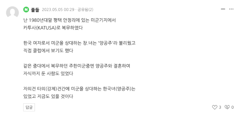 在韓聯(lián)社網(wǎng)站相關(guān)報(bào)道的評(píng)論區(qū)內(nèi),一名自稱上世紀(jì)80年代在駐韓美軍附編韓軍服役過的網(wǎng)友留言道:“我曾在美軍基地俱樂部中親眼見過這些所謂的‘洋公主’,也就是為美軍服務(wù)的韓國(guó)性工作者?!?/p>