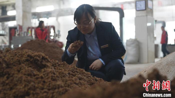 圖為閆珍愛在生產(chǎn)車間辨別酒醅發(fā)酵情況。(資料圖) 甘肅紅川酒業(yè)有限責(zé)任公司供圖