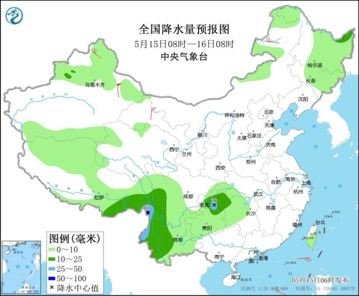 5月15日08時(shí)至16日08時(shí),黑龍江東北部、西藏東部、川西高原南部、重慶中部、云南西部等地部分地區(qū)有中到大雨,其中,云南西北部等地部分地區(qū)有暴雨(50~60毫米)。內(nèi)蒙古東北部、甘肅河西、新疆東部等地部分地區(qū)有4~6級(jí)風(fēng)。