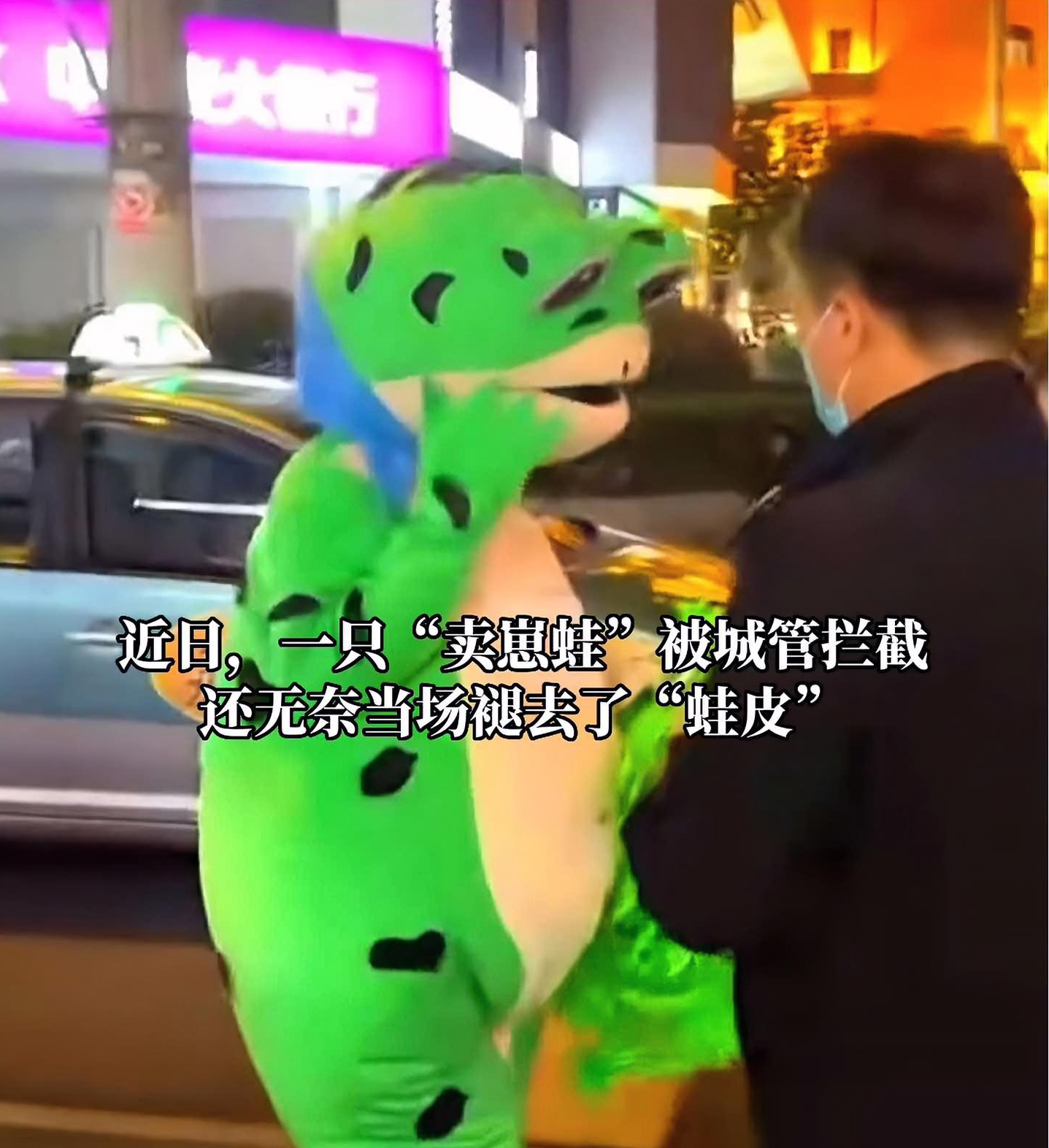最近,“網(wǎng)紅賣崽青蛙上海落網(wǎng)”在網(wǎng)上引起熱議。在上海街頭,一只“賣崽青蛙”被城管攔截,還無奈當(dāng)場(chǎng)褪去了“蛙皮”。