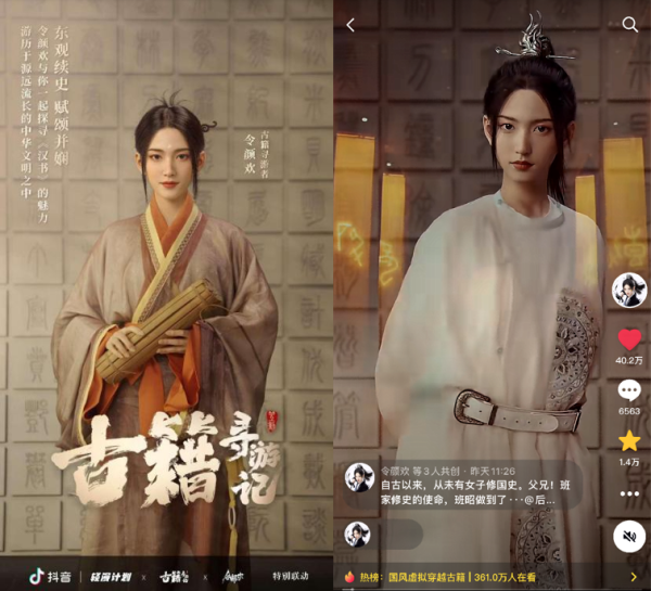 今年4月,抖音、字節(jié)跳動公益和四大博物館聯(lián)合發(fā)起的“古籍尋游記”特別活動,魔琺科技虛擬偶像令顏歡作以“古籍尋游者”身份攜手全能音樂人后弦在國家典籍圖書館上演了一場“跨時空”的聯(lián)動。令顏歡化身女史學(xué)家班昭,讓大眾透過經(jīng)典古籍歷史故事去觸摸歷史脈搏,感受中華文化生生不息、薪火相傳的人文精神。