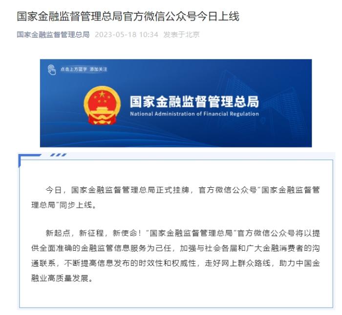 記者注意到,18日,國家金融監(jiān)督管理總局官方微信公眾號“國家金融監(jiān)督管理總局”同步上線,“國家金融監(jiān)督管理總局”官方網(wǎng)站也正式啟用。