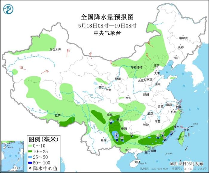 5月18日08時至19日08時,西藏東南部、川西高原、四川盆地東南部、貴州中西部和南部、江西南部、福建東部和南部、華南北部等地部分地區(qū)有中到大雨,局地有暴雨(50~70毫米)。內蒙古中部和西北部、浙江北部等地部分地區(qū)有4~6級風,其中,新疆南疆盆地和東部等地部分地區(qū)有6~7級風。
