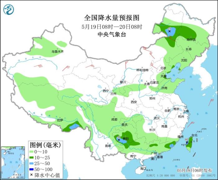 5月19日08時至20日08時,內蒙古東北部、黑龍江西南部、西藏東南部、貴州中南部、廣西西北部、廣東東部、臺灣島大部等地部分地區(qū)有中到大雨,局地有暴雨(50~80毫米)。內蒙古北部、甘肅河西、河北北部等地部分地區(qū)有4~6級風,其中,內蒙古中部、新疆南疆盆地等地部分地區(qū)有6~7級風。