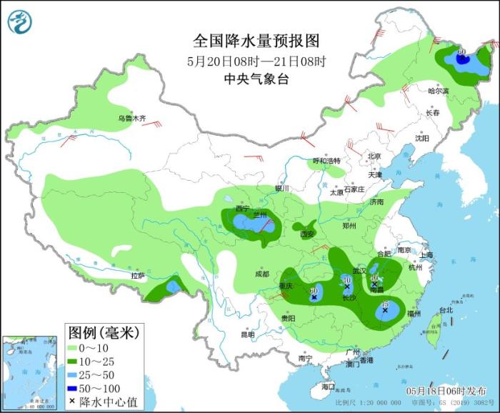 5月20日08時至21日08時,黑龍江中東部、西藏東南部、青海東部、甘肅東南部、江漢東部、江淮西部、江南中北部和東南部等地部分地區(qū)有中到大雨,其中,黑龍江東北部等地部分地區(qū)有暴雨(50~60毫米)。內蒙古、吉林西部、新疆沿天山地區(qū)和南疆盆地、甘肅中部、河北北部、湖北西部、四川盆地東南部等地部分地區(qū)有4~6級風,其中,內蒙古東部、黑龍江西北部等地的部分地區(qū)有6~7級風。
