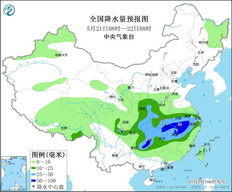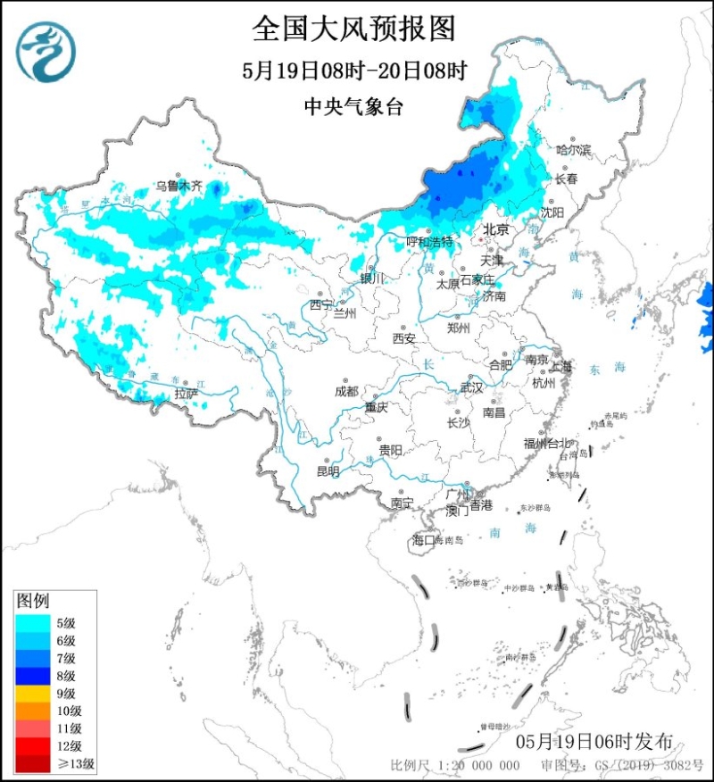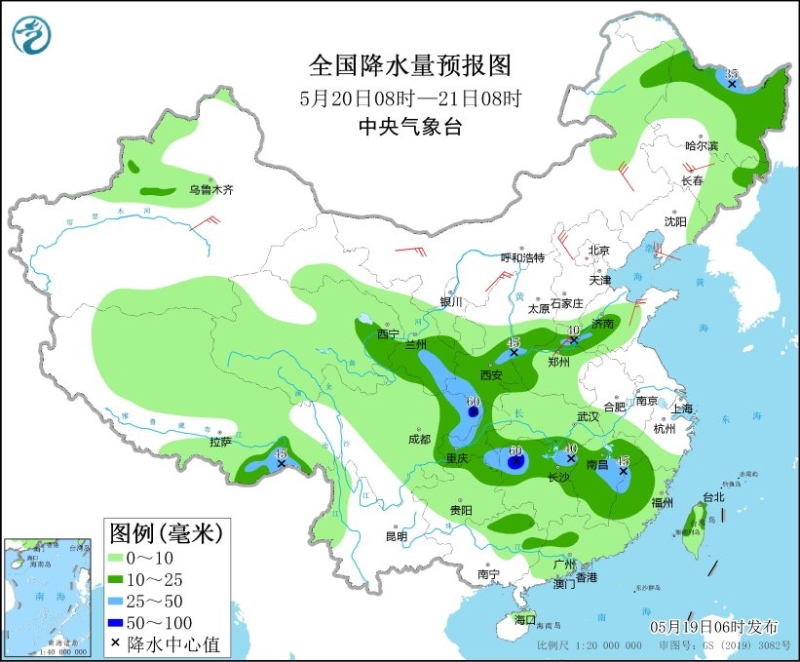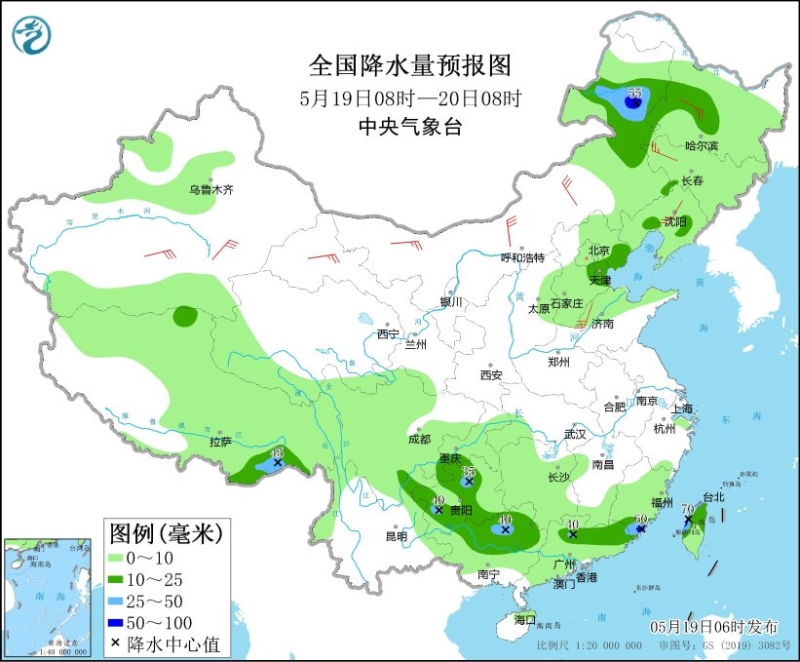 5月19日08時(shí)至20日08時(shí),內(nèi)蒙古東部、東北地區(qū)、華北中東部、新疆北部、西藏、西南地區(qū)東部和北部、江南西部和南部、華南大部等地部分地區(qū)有小到中雨,局地有大雨或暴雨(50~70毫米),上述部分地區(qū)伴有短時(shí)強(qiáng)降水,局地有雷暴大風(fēng)或冰雹等強(qiáng)對(duì)流天氣。內(nèi)蒙古、東北地區(qū)、西北地區(qū)東部等地部分地區(qū)有4~6級(jí)風(fēng)。