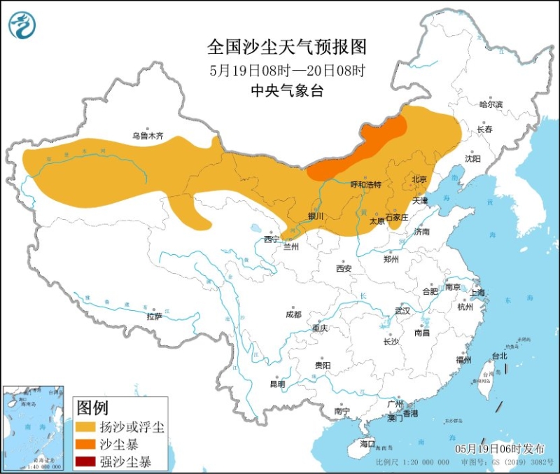 19日至20日,受冷空氣影響,新疆東部和南部、西北地區(qū)東部、內(nèi)蒙古、東北地區(qū)、華北等地將有一次大風(fēng)降溫和沙塵天氣。上述部分地區(qū)氣溫下降4~8℃,局部地區(qū)超過10℃。預(yù)計(jì),5月19日08時(shí)至20日08時(shí),內(nèi)蒙古、東北地區(qū)西部、新疆南部和東部、西北地區(qū)東部、華北北部等地部分地區(qū)有5~7級(jí)、局地8級(jí)以上的大風(fēng),陣風(fēng)風(fēng)力可達(dá)9~11級(jí);5月20日08時(shí)至21日08時(shí),內(nèi)蒙古、東北地區(qū)西部和南部、新疆南部和東部、西北地區(qū)東部、華北北部等地部分地區(qū)有5~6級(jí)、局地7級(jí)以上的大風(fēng),陣風(fēng)風(fēng)力可達(dá)8~10級(jí);5月19日08時(shí)至20日08時(shí),新疆南部和東部、青海西北部、內(nèi)蒙古中西部和東南部、甘肅西部、寧夏中北部、陜西北部、山西中北部、河北中北部、北京、天津等地的部分地區(qū)有揚(yáng)沙或浮塵天氣,其中,內(nèi)蒙古中西部偏北地區(qū)局部有沙塵暴。中央氣象臺(tái)5月19日06時(shí)繼續(xù)發(fā)布大風(fēng)藍(lán)色預(yù)警和沙塵暴藍(lán)色預(yù)警。