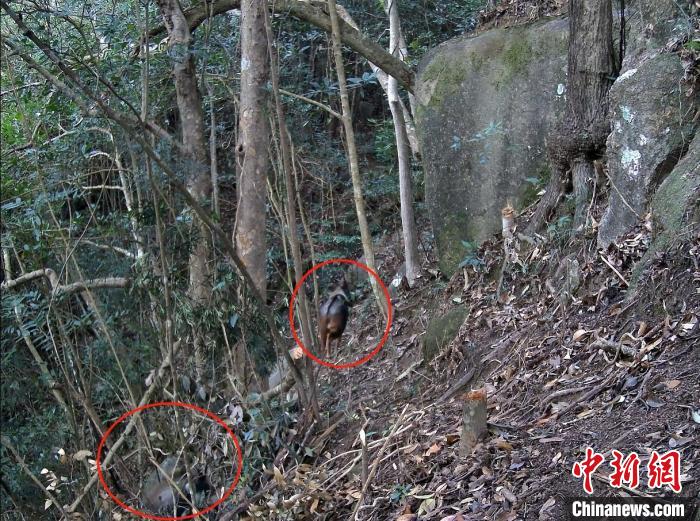 廣東象頭山保護區(qū)布設(shè)的紅外相機拍攝到兩頭中華鬣羚(紅圈內(nèi)) 廣東省林業(yè)局 供圖