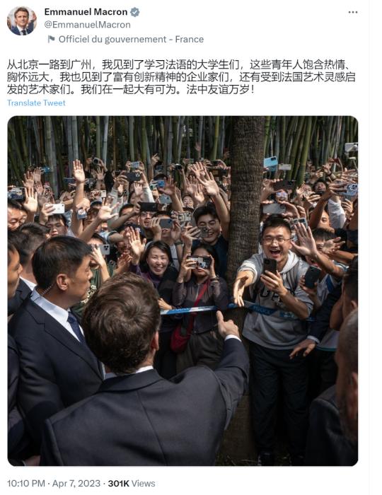 北京時(shí)間4月7日,在中國訪問的法國總統(tǒng)馬克龍?jiān)谏缃幻襟w“推特”上,用中文、英語和法語分享了自己的訪華感受,并表示“法中友誼萬歲!”