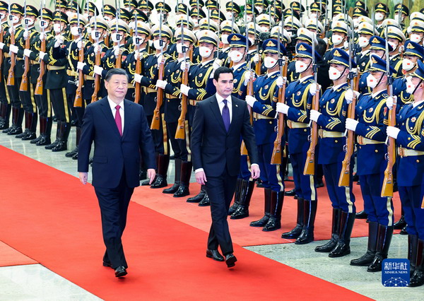 會(huì)談前,習(xí)近平在人民大會(huì)堂北大廳為謝爾達(dá)爾·別爾德穆哈梅多夫舉行歡迎儀式。