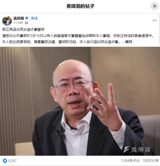 臺灣資深媒體人黃暐瀚19日于社交平臺貼出民進(jìn)黨前民意代表郭正亮的最新公開聲明,郭稱16日有人以損害民進(jìn)黨聲譽(yù)為由對其提出檢舉,并要求開除他的黨籍。郭宣布自行退出民進(jìn)黨。