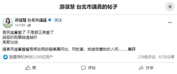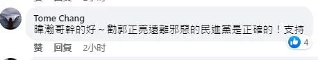 郭正亮退出民進(jìn)黨的消息被不少政治人物轉(zhuǎn)發(fā)。臺北市前議員羅智強(qiáng)表示,“正道不孤,郭正亮加油!”臺北市議員游淑慧表示,是民進(jìn)黨變了,不是郭正亮變了,與惡的距離越遠(yuǎn)越好。
