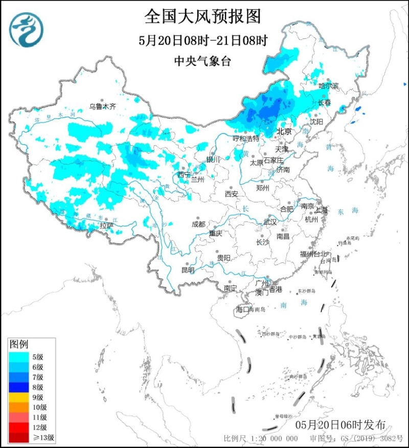 預(yù)計,5月20日08時至21日08時,內(nèi)蒙古中東部、華北北部、東北地區(qū)西部以及新疆南疆盆地和東部、甘肅河西、青海中西部、西藏中西部等地的部分地區(qū)有5~7級、局地8級以上的大風(fēng),陣風(fēng)風(fēng)力可達9~11級。