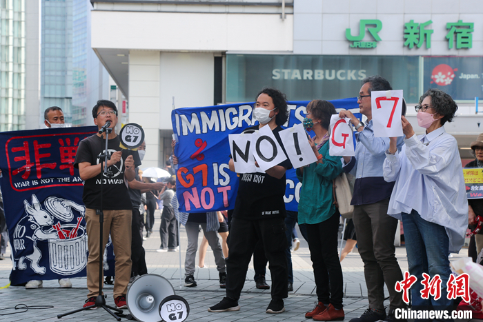 5月21日,日本民眾手舉標(biāo)語,在東京新宿車站附近舉行集會,強(qiáng)烈抗議G7廣島峰會。 中新社發(fā) 蔣文月 攝