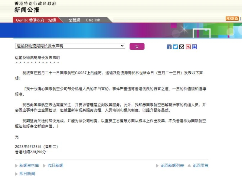 中新網(wǎng)5月24日電 據(jù)香港特區(qū)政府新聞公報(bào)消息,就旅客在5月21日國泰航班CX987上的經(jīng)歷,香港運(yùn)輸及物流局局長林世雄5月23日發(fā)表聲明。