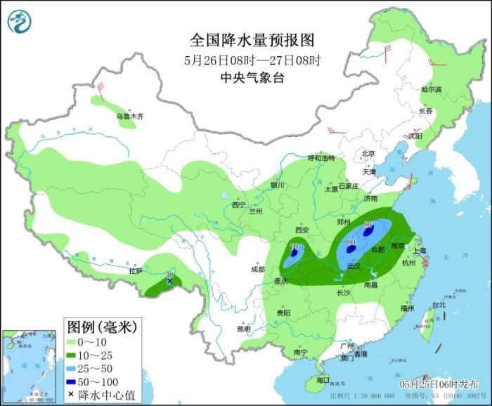 5月26日08時至27日08時,黃淮南部、江淮、江漢大部、西南地區(qū)東北部、江南北部等地部分地區(qū)有中到大雨,其中,安徽北部、河南西南部、湖北東北部、四川盆地東北部等地部分地區(qū)有暴雨(50~80毫米)。內(nèi)蒙古中東部、黑龍江北部、遼寧中部、新疆北疆、山東半島等地部分地區(qū)有4~6級風(fēng),其中,浙江東部沿海有6~7級風(fēng)。