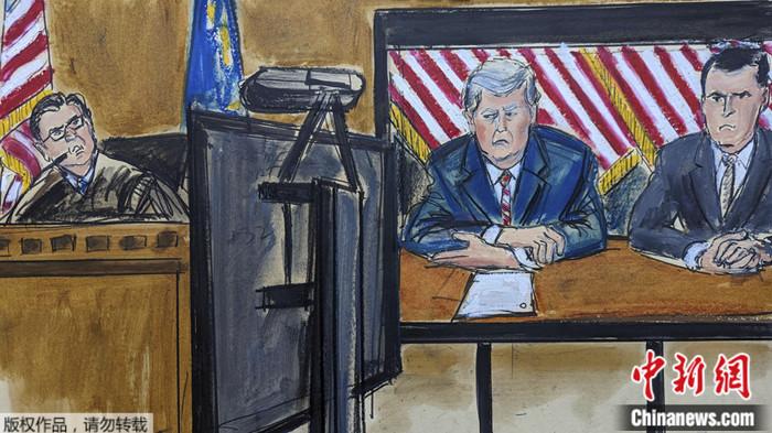 當(dāng)?shù)貢r間5月23日,美國前總統(tǒng)特朗普通過視頻方式出席審前聽證會。圖為法庭現(xiàn)場素描。