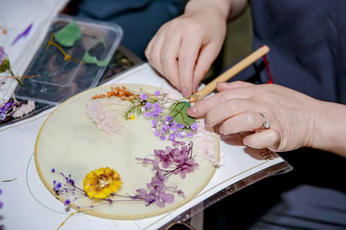團(tuán)扇,是中國漢族傳統(tǒng)工藝品及藝術(shù)品,代表著團(tuán)圓友善、吉祥如意;干花,經(jīng)過晾曬,保留原本的形態(tài)和顏色,蘊(yùn)含永恒之意。當(dāng)天,心靈手巧的嘉賓們發(fā)揮想象力,利用各式各樣的干花和綠葉,在扇面上巧妙組合,繪制出一幅幅優(yōu)美的畫卷。初夏清風(fēng)襲來,佳麗們手執(zhí)團(tuán)扇,一搖一曳間盡顯東方魅力。以扇面為底,以干花為飾,燕之屋母親節(jié)團(tuán)扇主題活動分享著對美的解讀,也傳遞著媽媽們對生活的熱愛和向往。