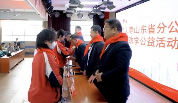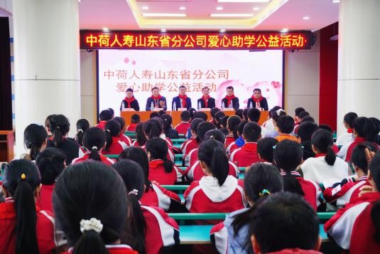 傳遞一份愛心,成就一份夢想。此次活動,中荷人壽山東省分公司還在臨沂三里莊小學(xué)同步開展了“關(guān)愛齊魯 用愛結(jié)緣”愛心助學(xué)活動。山東省分公司為學(xué)校送去了多套學(xué)習(xí)用品和體育器材,幫助學(xué)校改善課外活動基礎(chǔ)設(shè)施,為孩子們擁有一個健康、快樂的學(xué)習(xí)環(huán)境助力。學(xué)生們?yōu)閰I(lǐng)導(dǎo)們佩戴了紅領(lǐng)巾并獻(xiàn)上誠摯的隊禮,學(xué)校領(lǐng)導(dǎo)代表師生為中荷人壽山東省分公司送上“愛心助學(xué) 功在千秋 捐資助學(xué) 大愛無疆”的錦旗,并勉勵孩子們不負(fù)韶華,以夢為馬立志成才,將中荷人壽的愛心捐贈化為勤奮學(xué)習(xí)的動力,弘揚美德、樂觀向上,爭做“對人好、對社會好”的優(yōu)秀少先隊員。