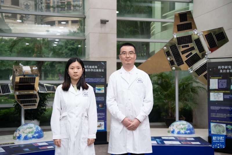 5月24日,澳科大月球與行星科學(xué)國家重點實驗室博士后研究員尹亮(右)、澳科大太空科學(xué)研究所碩士研究生易思琦在澳門科技大學(xué)合影。新華社記者 張金加 攝