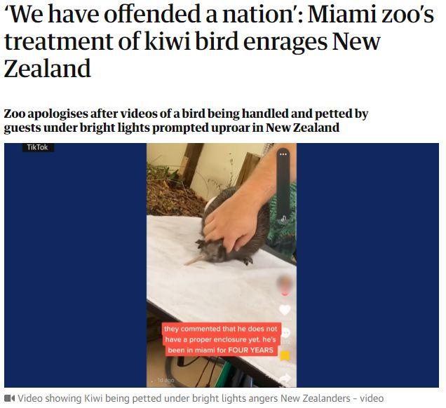 新西蘭總理希普金斯在24日的新聞發(fā)布會(huì)上,感謝邁阿密動(dòng)物園停止了這項(xiàng)互動(dòng)活動(dòng)。“他們已經(jīng)承認(rèn)他們做的事,對(duì)幾維鳥(niǎo)來(lái)說(shuō)是不合適的,或者是不正確的、不公平的?!?/p>