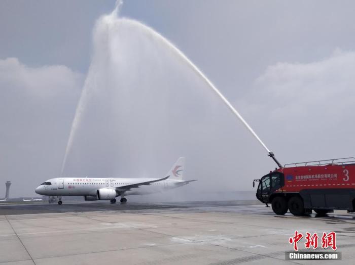 C919商業(yè)航班首飛抵達(dá)北京過“水門”。東航供圖
