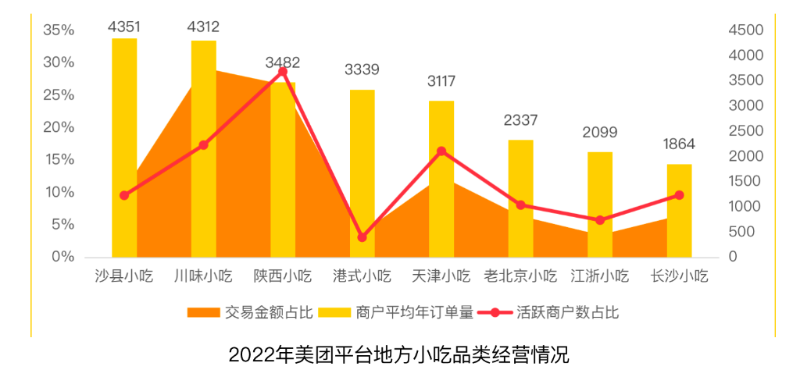 2022年在美團平臺上各地方小吃品類中,沙縣小吃活躍商戶數(shù)占比為9.6%,占地方小吃總交易額的10.4%,店均年訂單量超過4000單,超過其他地方小吃品類位列第一,在各主要小吃品類中交易金額排第四位。