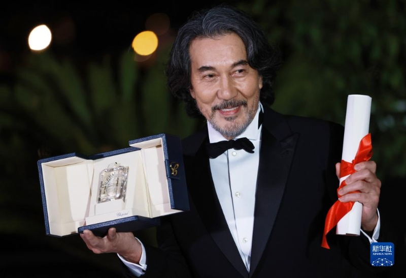 5月27日,在法國戛納,憑借影片《完美的日子》獲得電影節(jié)最佳男演員獎(jiǎng)的日本演員役所廣司展示獎(jiǎng)杯。
