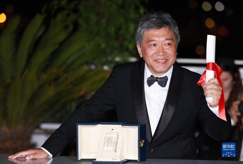 5月27日,在法國戛納,日本影片《怪物》的導(dǎo)演是枝裕和展示獎(jiǎng)杯。該片獲得本屆電影節(jié)最佳編劇獎(jiǎng)。