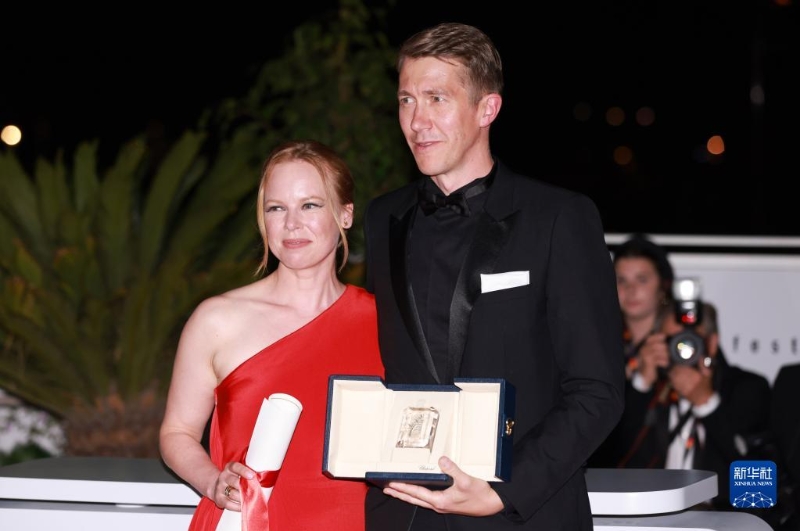 5月27日,在法國戛納,芬蘭影片《枯葉》的演員阿爾瑪·波斯蒂(左)和尤西·瓦塔寧代表導(dǎo)演阿基·考里斯馬基領(lǐng)取評審團(tuán)獎(jiǎng)。